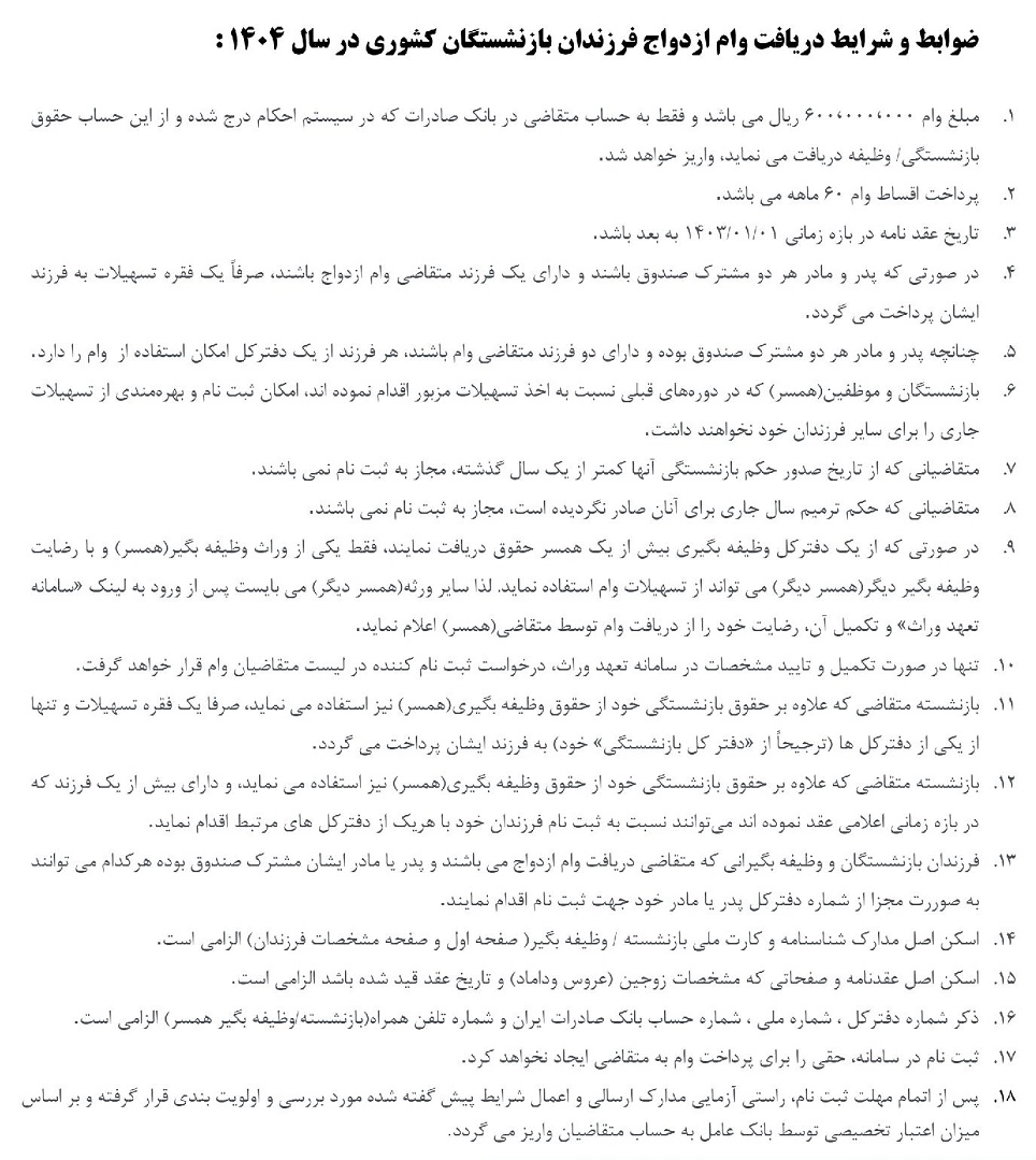 نهمین دوره ثبت نام وام ازدواج فرزندان بازنشستگان کشوری