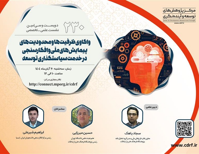 دویست و سی امین نشست علمی - تخصصی مرکز پژوهش های توسعه و آینده نگری، تحت عنوان واکاوی ظرفیت ها و محدودیت های پیمایش ملی و افکارسنجی در خدمت سیاست گذاری توسعه، به صورت مجازی برگزار می شود.