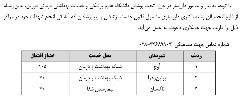 جذب نیروی داروساز مشمول قانون خدمت ۲۵ آذر ۱۴۰۴ | ۰۹:۰۰ کد : ۵۷۰۵۷ اطلاعیه ارسال به دیگران نام شما ایمیل شما ایمیل دریافتکننده ارسال انصراف تعداد بازدید:۱۹۶۵ جذب نیروی داروساز مشمول قانون خدمت در دانشگاه علوم پزشکی قزوین