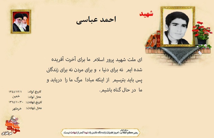 فرازی از وصیت نامه شهدا ۱۳ دی ۱۴۰۴ | ۱۰:۰۱ کد : ۵۷۴۶۹ اطلاعیه ارسال به دیگران نام شما ایمیل شما ایمیل دریافتکننده ارسال انصراف تعداد بازدید:۲۱۱ فرازی از وصیت نامه شهدا فرازی از وصیت نامه شهید بزرگوار احمد عباسی :