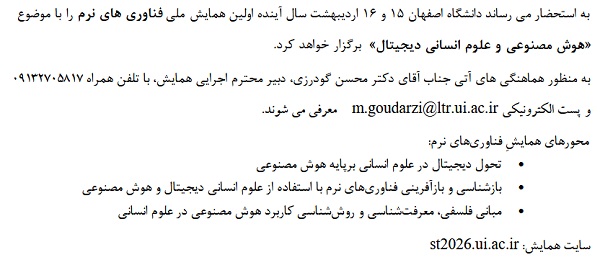 کلیدواژه‌ها: دانشگاه اصفهان همایش هوش مصنوعی علوم انسانی دیجیتال دانشگاه علوم پزشکی اصفهان