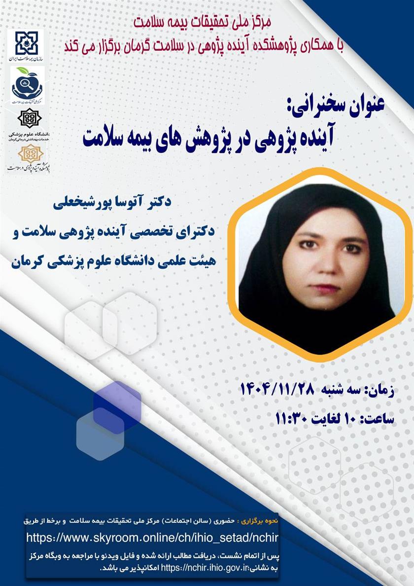 نشست علمی - تخصصی آینده پژوهی در پژوهش های بیمه سلامت ۲۶ بهمن ۱۴۰۴ | ۱۲:۱۹ کد : ۵۸۰۱۲ اطلاعیه ارسال به دیگران نام شما ایمیل شما ایمیل دریافتکننده ارسال انصراف تعداد بازدید:۹۳ نشست علمی - تخصصی آینده پژوهی در پژوهش های بیمه سلامت